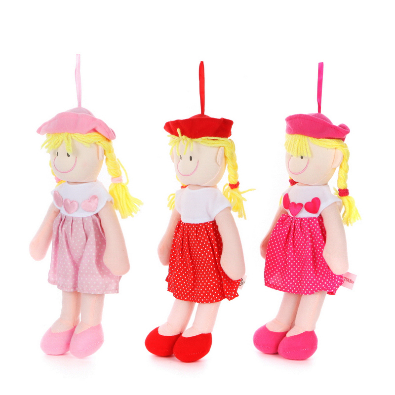 Cute plush rag doll dressed in beautiful dress with heart logo and matching hat. Baby girl toy has blond curly hair, rosy cheeks, charming smile. The design itself brings out the cuteness and sweetness of the doll.