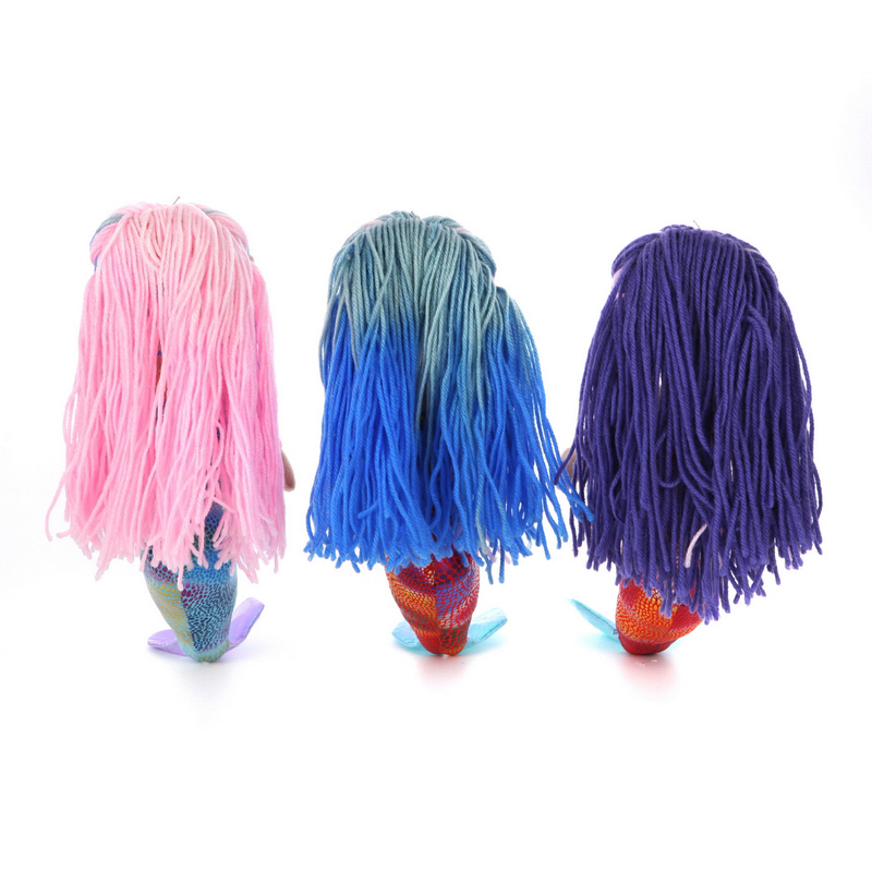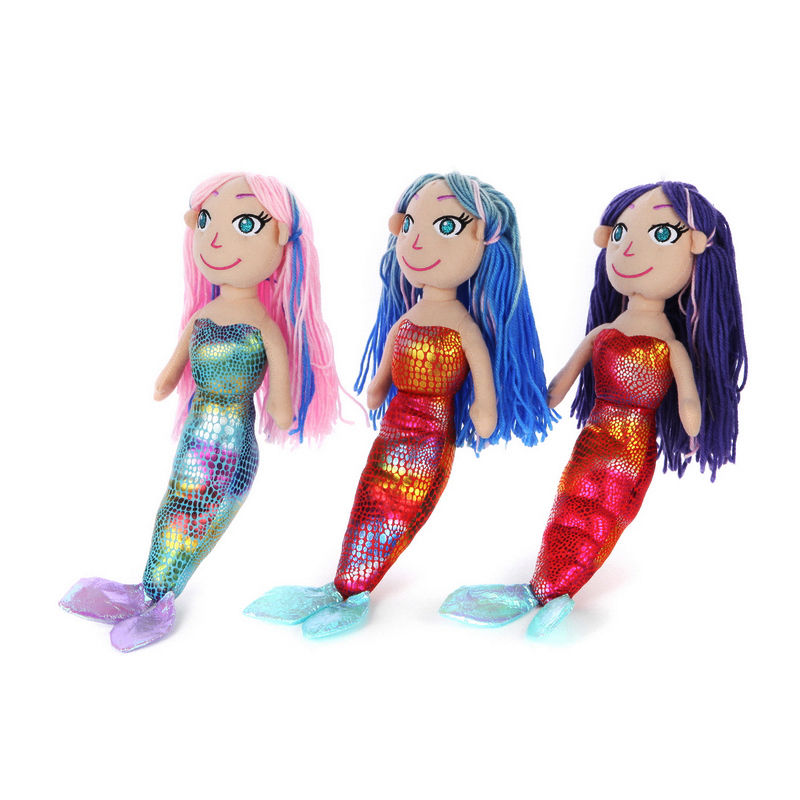 The mermaid plush toy is made of smooth,shiny and soft fabric.Embroidery glitter eyes and full details of face .There is no small parts, all stitches are sewn very well,it is safe and no chocking hazard for kids to play with. She has long curly hair and weet smile which makes her look more attractive and cuddly.it is an ideal gift for baby,little girls.
