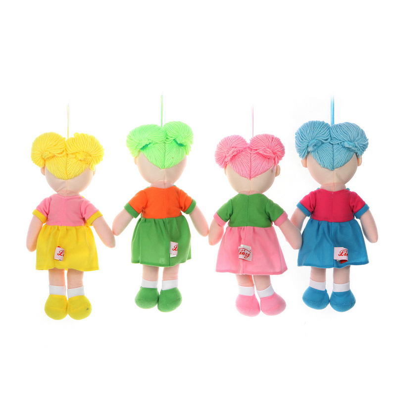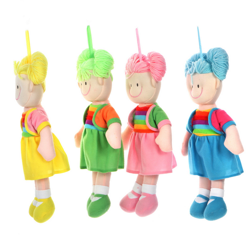 Cute plush girl doll dressed in beautiful rainbow dress. Baby girl toy has different hair, rosy cheeks, charming smile. The design itself brings out the cuteness and sweetness of the doll.